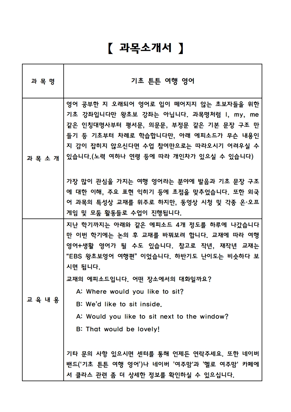 영어 공부한 지 오래되어 영어로 입이 떼어지지 않는 초보자들을 위한 기초 강좌입니다만 왕초보 강좌는 아닙니다. 과목명처럼 I, my, me 같은 인칭대명사부터 평서문, 의문문, 부정문 같은 기본 문장 구조 만들기 등 기초부터 차례로 학습합니다만, 아래 에피소드가 무슨 내용인지 감이 잡히지 않으신다면 수업 참여만으로는 따라오시기 어려우실 수 있습니다.(노력 여하나 연령 등에 따라 개인차가 있으실 수 있습니다)