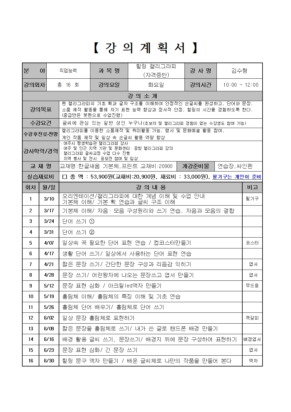 | 교육시간 | 매주 화 10:00 ~ 12:00 |