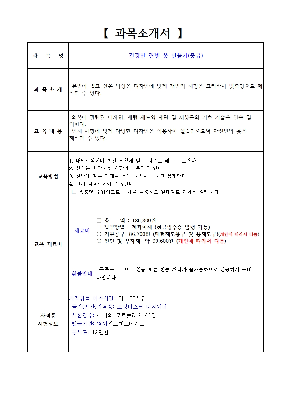 정규프로그램 2026년 상반기 정규프로그램 건강한 린넨옷 만들기(중급)