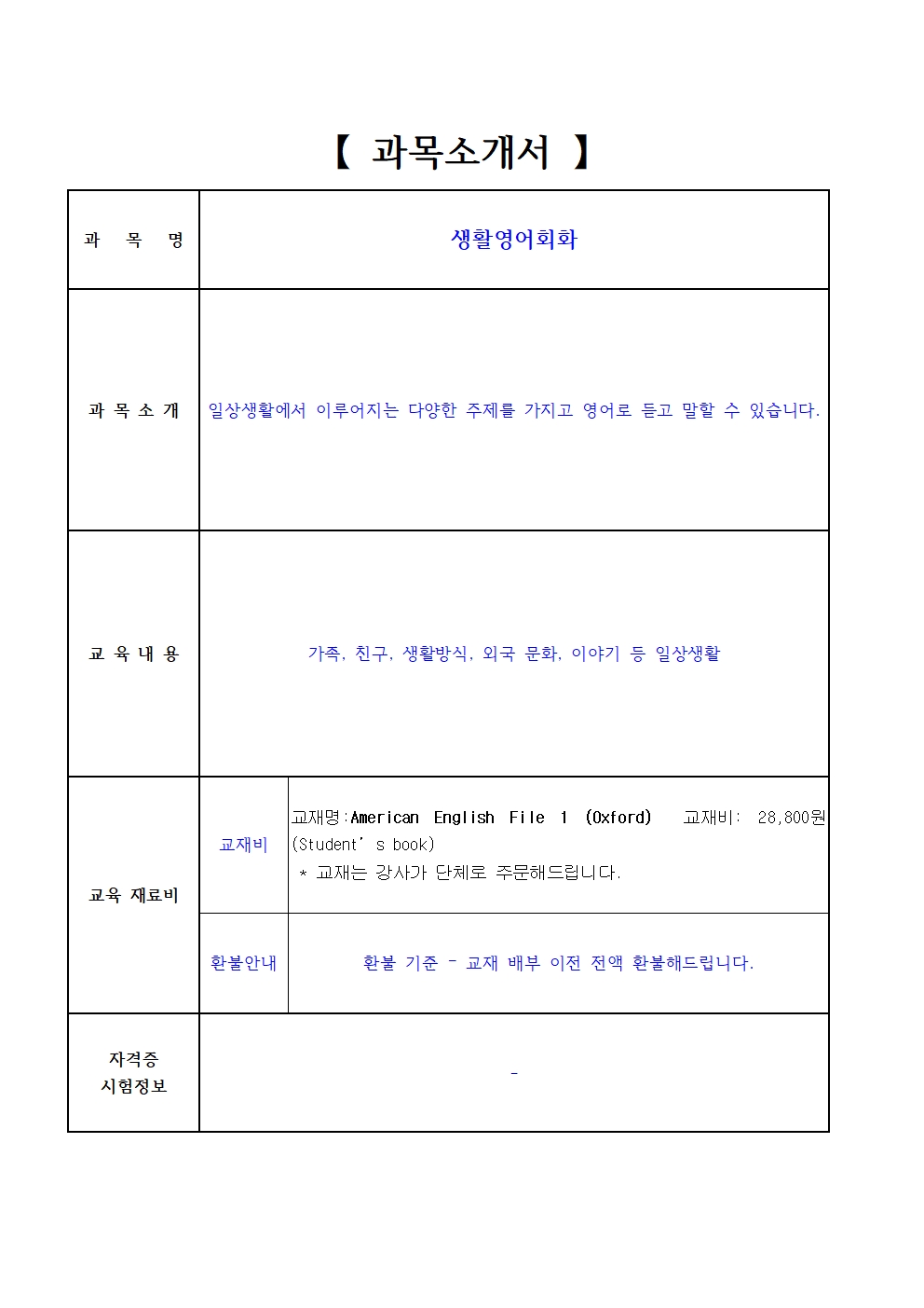 | 수강관련 문의처 | 평생교육과 평생학습팀 / 031-887-3322 / yujin7878@korea.kr |