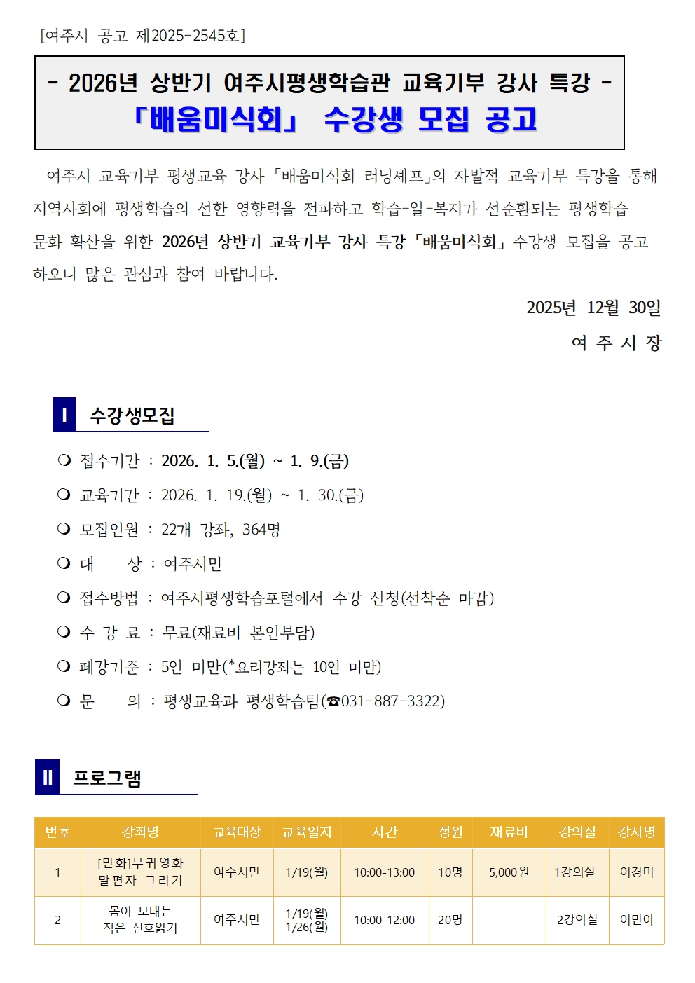 2026년 상반기 여주시평생학습관 교육기부 강사 특강 [배움미식회] 수강생 모집 공고